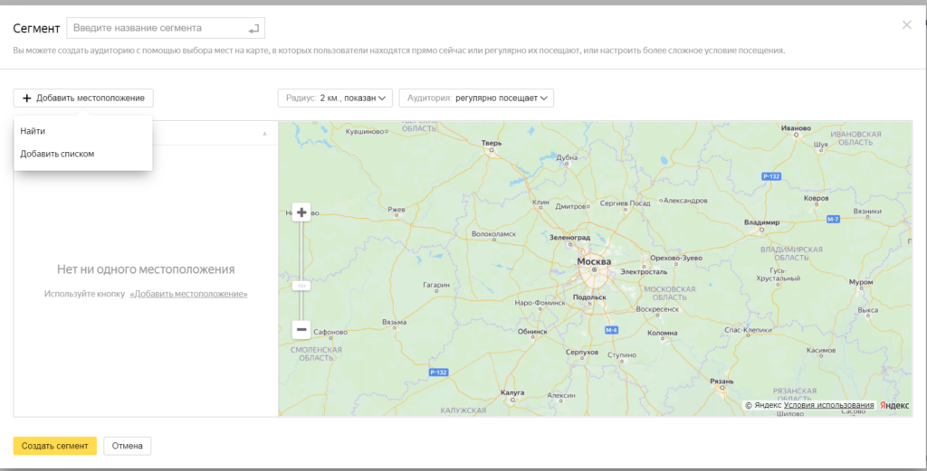 Вводите название сегмента и добавляете местоположения. Сделать это можно несколькими способами.