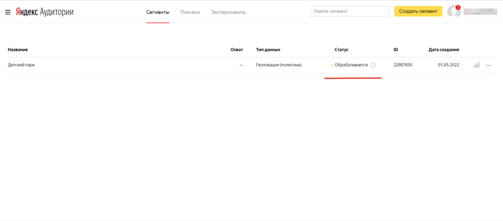 После создания сегмента система начинает его обрабатывать. Это может занять до 2-х часов.