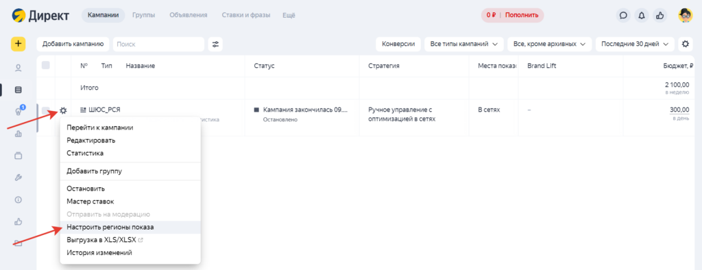 нажимаете на знак «шестерёнки» рядом с названием кампании;
