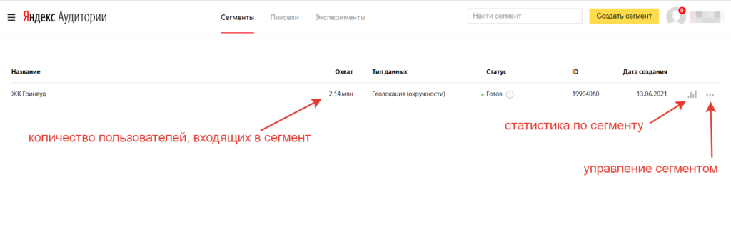 В обработанном сегменте доступен охват и общая статистика. Есть возможность управлять сегментом: создать на его основе сегмент похожих пользователей, переименовать, предоставить доступ другому человеку или удалить.