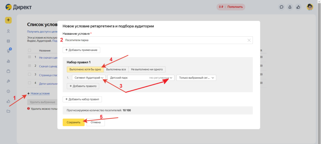 В новом диалоговом окне пишете название. В наборе правил выбираете тип «Сегмент аудитории». В соседнем поле выбираете нужный сегмент. Отмечаете условие – «Выполнено хотя бы одно» и нажимаете «Сохранить»: