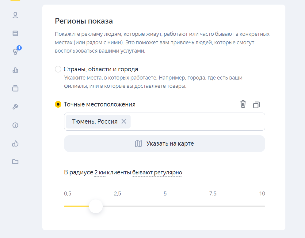 В 2022 году в рекламной системе Яндекса добавился таргетинг «точное местоположение». Эта настройка позволяет показывать рекламу людям, находящимся в конкретном месте. Например, владелец бизнеса может задать радиус около своего магазина или кафе и привлекать тех, кто находится поблизости.