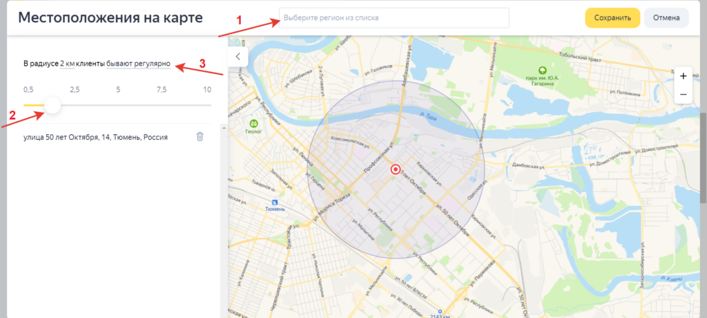 После добавления местоположений устанавливаете нужный радиус от 500 метров до 10 километров.