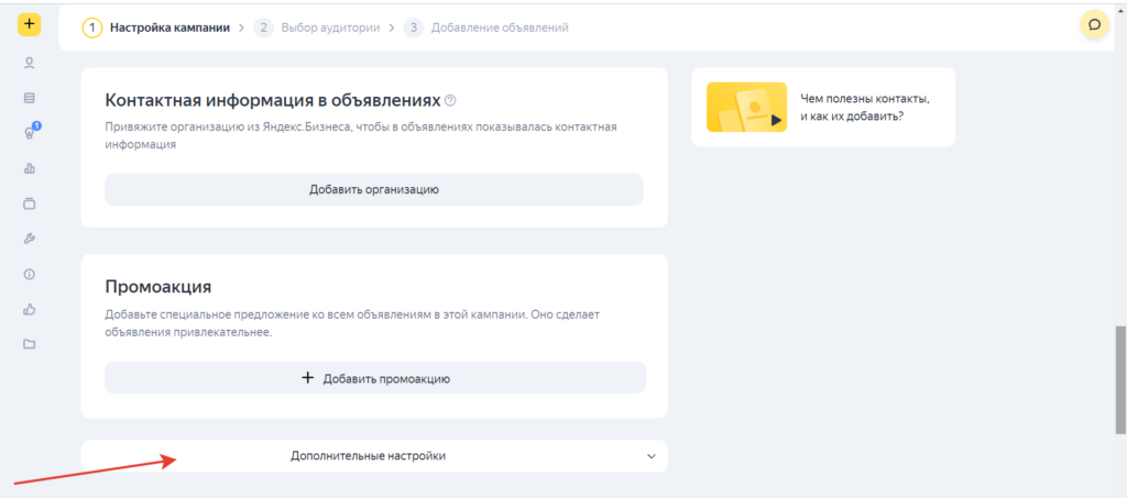 В настройках на уровне кампании выбираете раздел «Дополнительные настройки»: