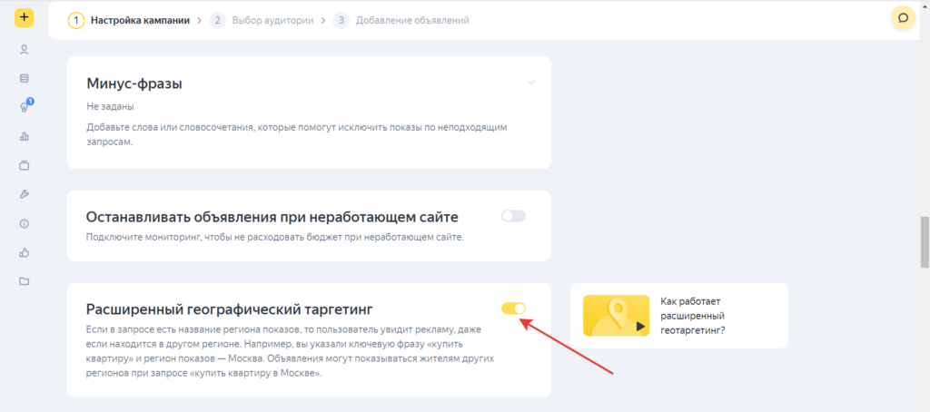 Здесь находите блок «Расширенный геотаргетинг». По умолчанию он активен. Если опция вам не нужна — переключаете ползунок.