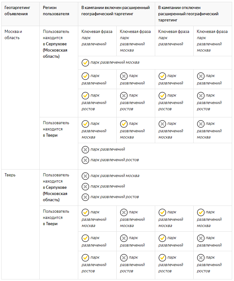Наглядно все варианты сочетания ключевых слов с упоминанием геолокации и расширенного геотаргетинга представлены в таблице из Справки Директа: