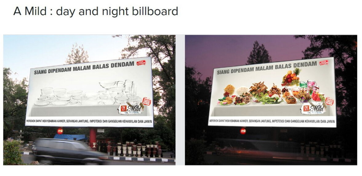 В наружной рекламе сигарет со вкусом корицы A Mild, а во время Рамадана курить тоже можно не всегда, в светлое время суток была показана пустая посуда, а после заката — с едой и напитками. В 2021 году динамичные биллборды воспринимались индонезийцами как что-то фантастическое.