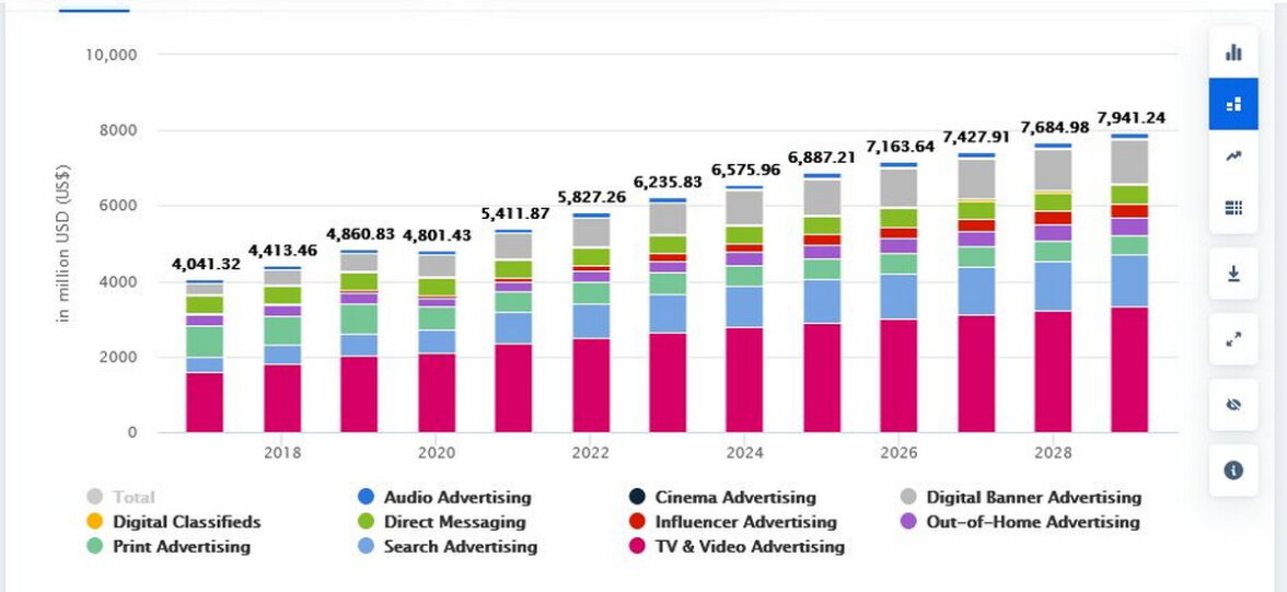 По данным международного аналитического сервиса Statista, в 2023 году объем рекламного рынка в Индонезии составил $6,2 млрд (рост на 7% к 2022-му). По объемам размещения лидерами были видеореклама (ТВ и онлайн-видео) — $2,7 млрд, интернет-реклама ($1,9 млрд), реклама в прессе ($565 млн) и наружная реклама ($310 млн). На рекламу у инфлюенсеров в 2023 году индонезийские бренды потратили $195 млн.