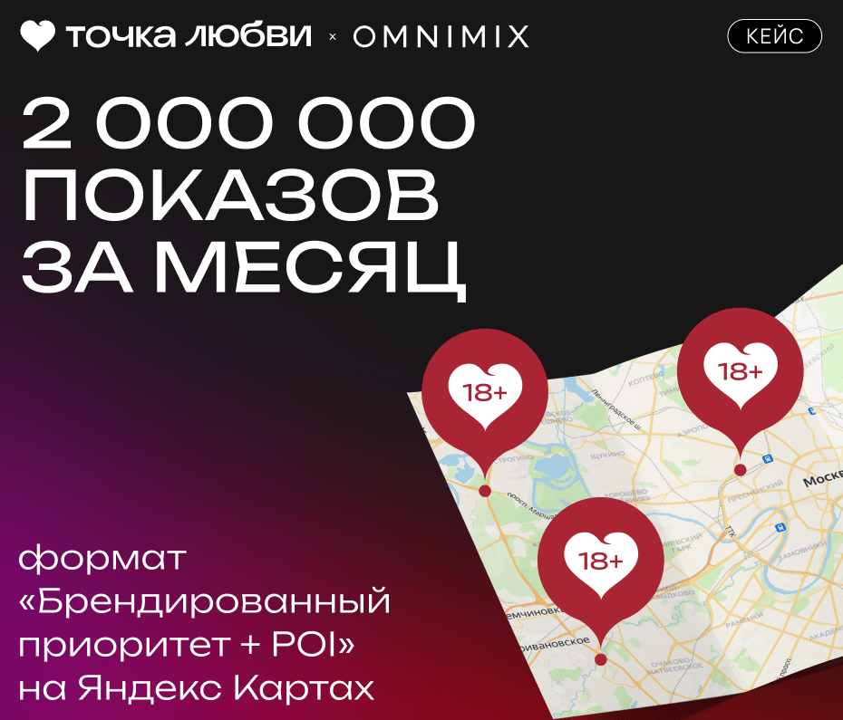 Как увеличить продажи в офлайн-магазинах за счёт цифровых инструментов? В этом кейсе вы узнаете, как крупнейшая сеть магазинов для взрослых в России — «Точка Любви» — с помощью агентства OMNIMIX вывела рекламу на новый уровень. Мы расскажем, как точечный таргетинг и брендированный формат на Яндекс Картах привлекли миллионы показов и тысячи новых клиентов, а также поделимся инсайтами, которые помогут вашему бизнесу повторить этот успех.