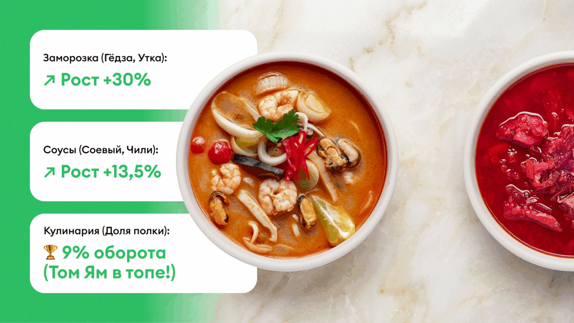 Для тех, кто ценит время, растет категория «умной» заморозки. Спрос на азиатские полуфабрикаты, например, утку по-пекински или гёдза, вырос в среднем на 30%. Покупатели оценили возможность получить ужин ресторанного уровня за 15 минут, при этом будучи уверенными в натуральности состава.