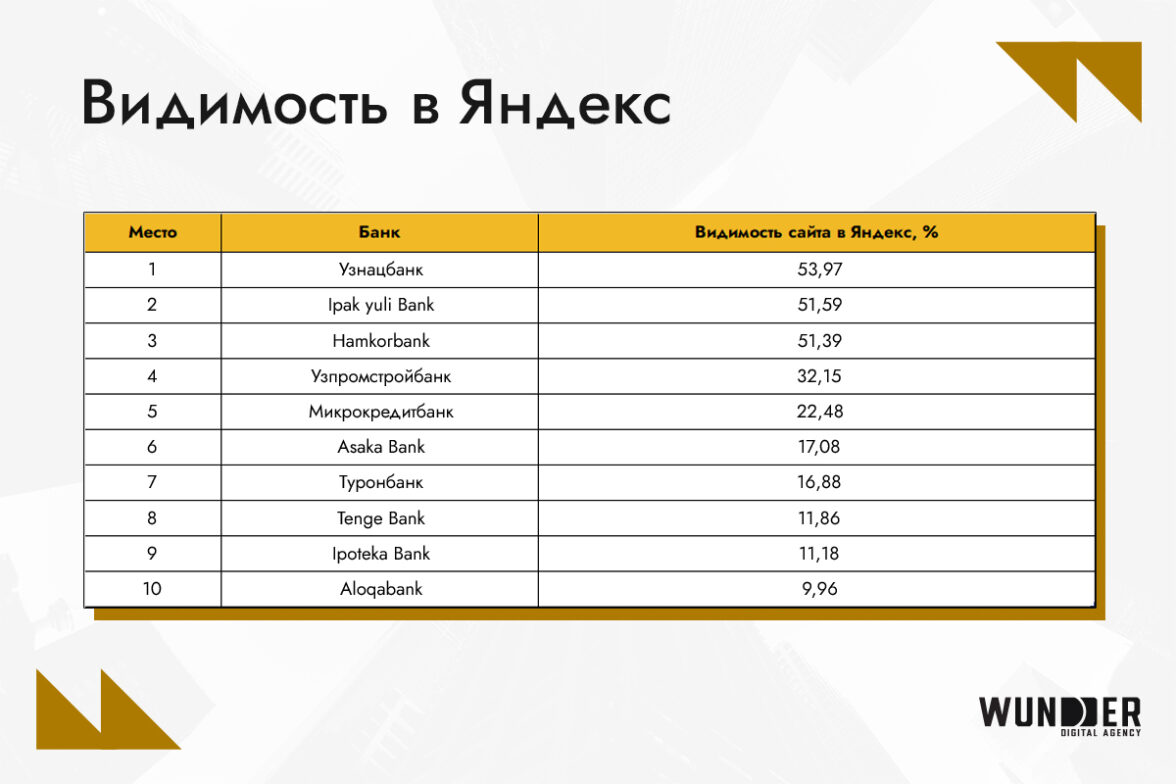 В Яндексе лидером стал «Узнацбанк» с видимостью 53,97%, хотя его показатели снизились с 68% в июне. Ipak Yuli Bank поднялся с третьего на второе место, увеличив видимость на 8,59%. Hamkorbank замкнул тройку лидеров с результатом 51,39%.