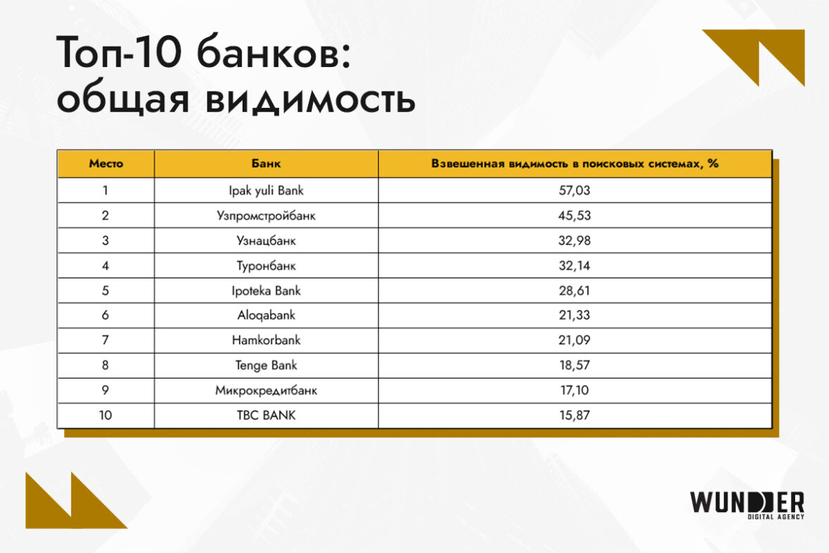 На основе собранных данных был составлен рейтинг SEO-эффективности банков Узбекистана.