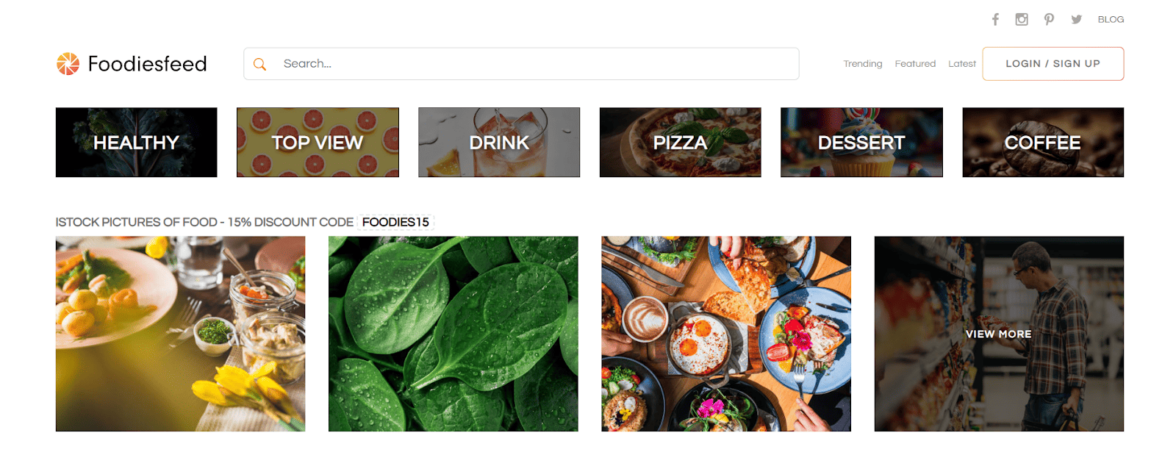Главная страница FoodiesFeed с поисковиком и некоторыми категориями