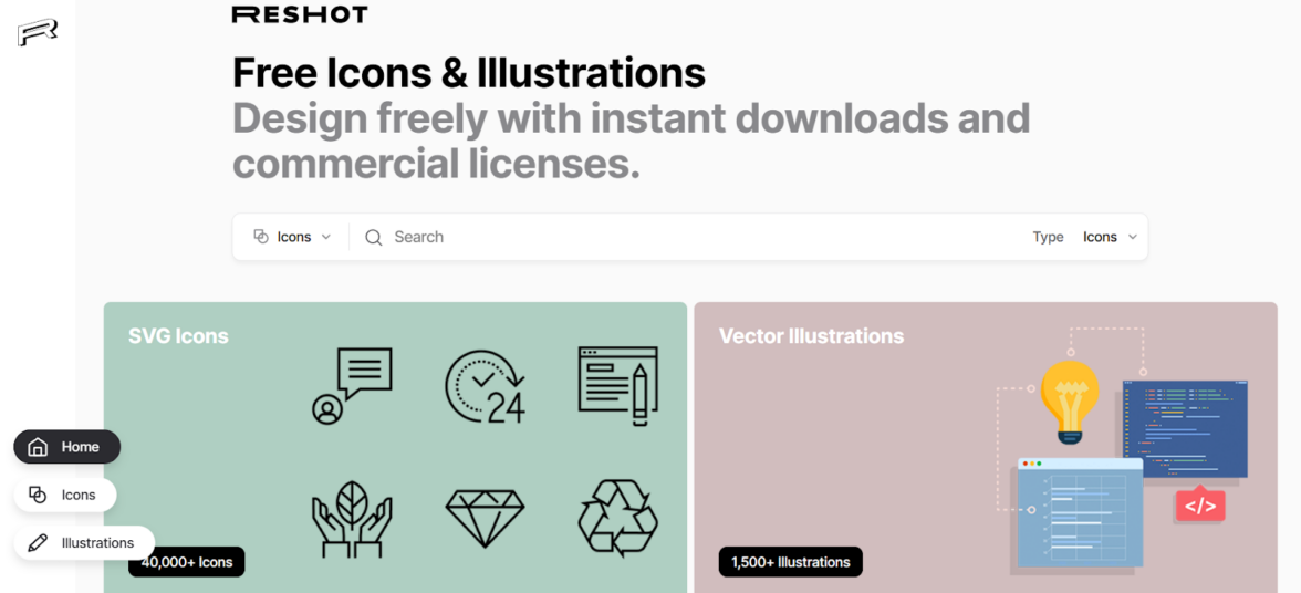 Reshot — платформа с иконками и иллюстрациями. На стоке есть более 40 000 SVG-иконок и наборов иконок для сайтов, приложений, презентаций и маркетинговых материалов, а также свыше 1500 авторских иллюстраций в разных стилях и тематиках. Все материалы доступны в популярных форматах: SVG и PNG.