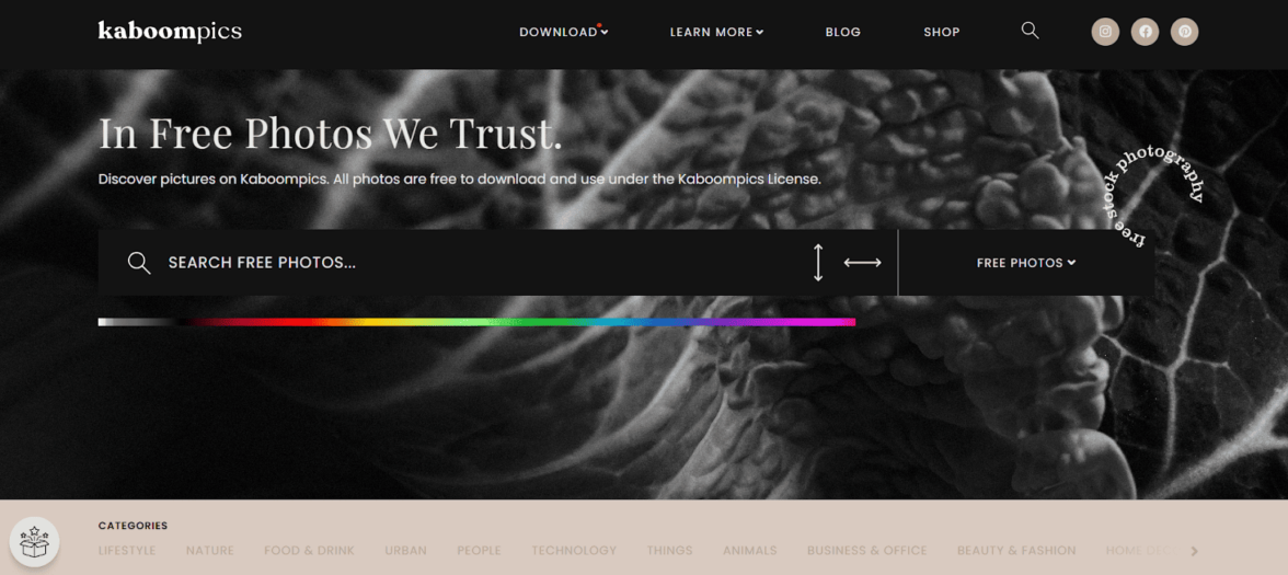 Kaboompics работает по единой лицензии: фото можно использовать бесплатно, без обязательной атрибуции. Но приветствуется благодарность фотографу, как и на других стоках. Здесь небольшой, но качественный выбор — более 17 000 изображений и почти 1500 тематических фотосессий.