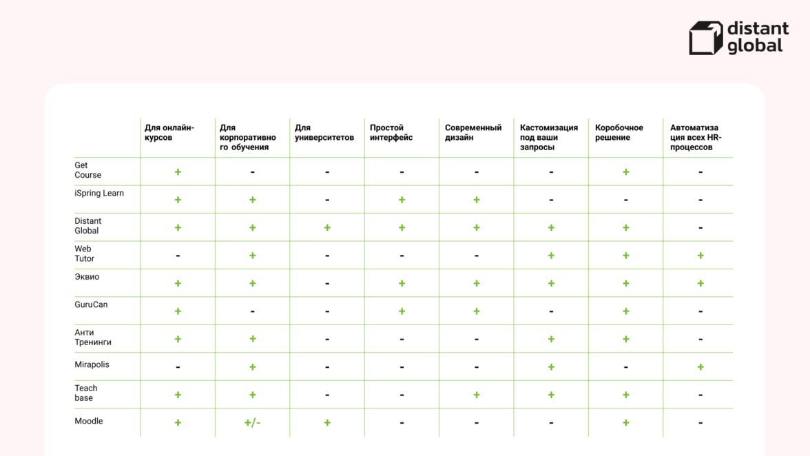 ➖ Недостатки: на данный момент на платформе нет компетентностной модели, связанной с организационной структурой компаний клиентов. Кроме того, Distant Global не подойдет частным репетиторам, коучам и фрилансерам.