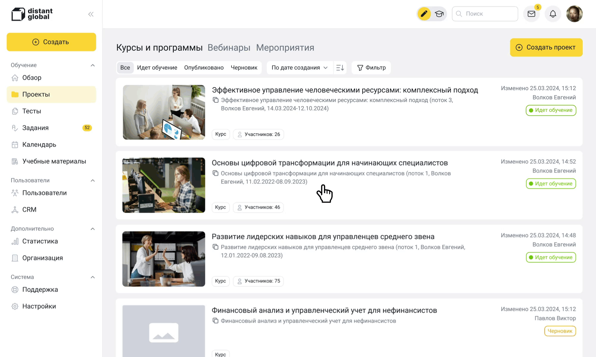 Краткое описание: LMS/LXP-система с гибкими настройками для запуска корпоративных школ и ДПО, акселерационных и федеральных программ для университетов. Платформа автоматически собирает расширенную статистику, ее удобно просматривать. Distant Global регулярно обновляется, разработчики добавляют новые инструменты для персонализации обучения. Благодаря этому слушатели перестают проматывать онлайн-курсы и вовлекаются в процесс. Например, в корпоративной школе ГТЛК на платформе Distant Global активность слушателей достигла 90% и продолжает расти.