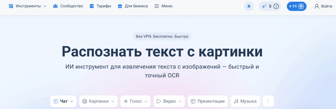 Агрегатор, предоставляющий доступ к мощным моделям через упрощенный интерфейс. Нейросеть выполнит распознавание текста с изображения быстро, даже если исходный файл имеет низкое разрешение или был снят под углом. goGPT делает ставку на доступность и простоту: пользователю не нужно разбираться в настройках весов модели, достаточно просто загрузить файл.