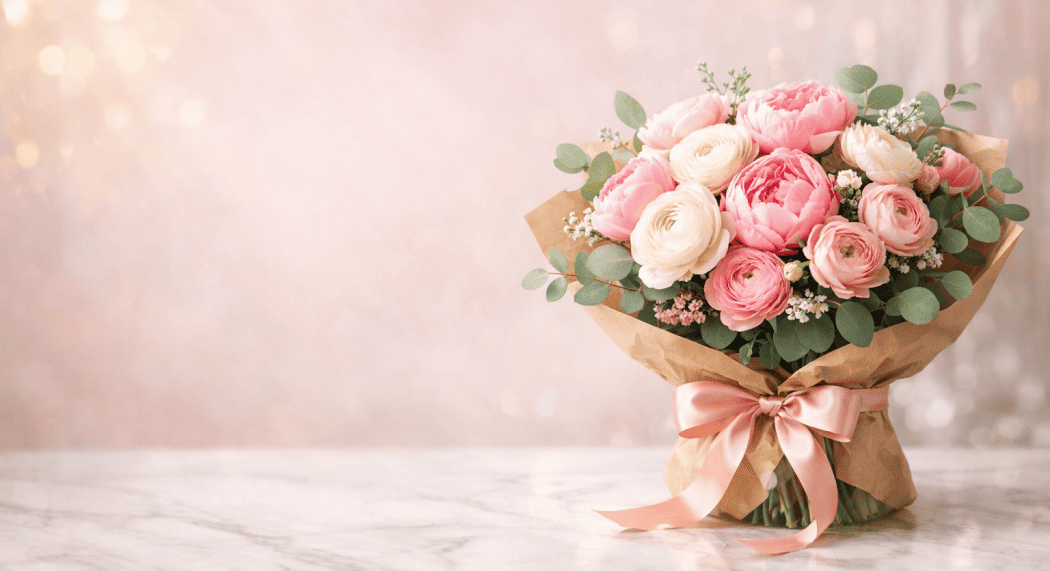 Элегантный горизонтальный баннер для цветочной мастерской. В правой части — пышный букет из пионов, ранункулюсов и эвкалипта в крафтовой упаковке, перевязанной атласной лентой. Букет стоит на мраморной поверхности. Фон — размытый, нежно-розовый с золотистыми бликами от естественного света из окна. Стиль: художественная фотография, нежная пастельная гамма, высокая детализация лепестков и текстур. Левая половина — пространство для текста. Общая атмосфера: свежесть, весна, изящество. Антипромпт: wilted flowers, dead petals, dark moody atmosphere, artificial plastic look, oversaturated colors, vase, multiple bouquets, human hands, text, logo, watermark, cartoon style, flat illustration, harsh shadows, messy composition.