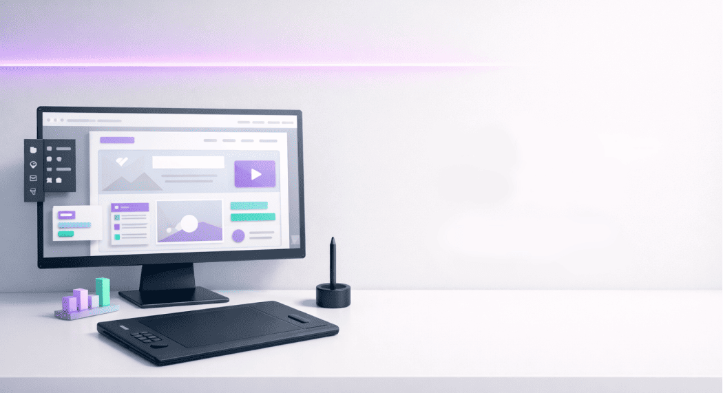 Рекламный баннер для онлайн-школы, горизонтальный формат. Композиция: стилизованное рабочее место дизайнера — монитор с открытым макетом сайта, рядом графический планшет и стилус. Окружение — минималистичный рабочий стол на фоне светлой стены с тонкой неоновой подсветкой фиолетового оттенка. Стиль: 3D-рендер с мягкими тенями, чистые линии, современная цифровая эстетика. Правая часть баннера — свободная зона для заголовка и кнопки. Палитра: белый, светло-серый, акценты — электрический фиолетовый и мятный. Антипромпт: photorealistic people, faces, text on screen, illegible UI elements, dark gloomy atmosphere, grunge textures, vintage style, excessive shadows, pixelated, low quality, stock photo feel, busy background, multiple monitors.