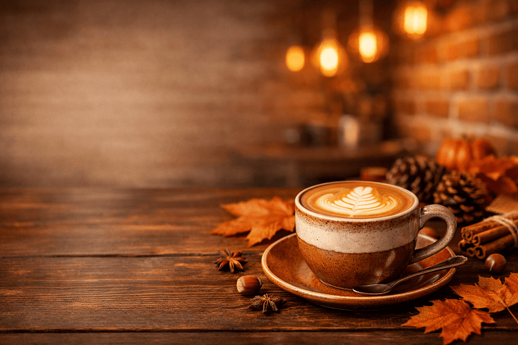 Теплый, уютный баннер с акцентом на чашке латте и осенней палитре и со свободным пространством для текста.