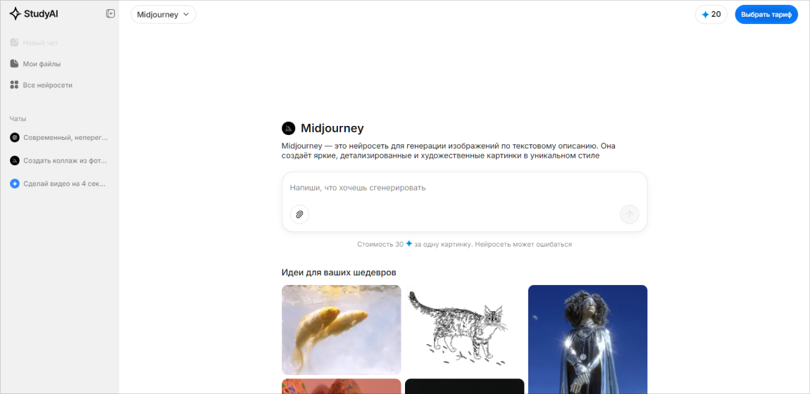 Study AI — платформа с библиотекой тематических ботов, среди которых генераторы визуального контента для рекламных и образовательных задач.
