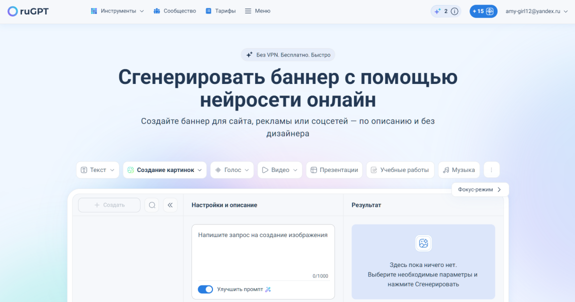 ruGPT — отечественный сервис с разделом для баннерной графики, поддержкой ведущих моделей и полной русификацией.