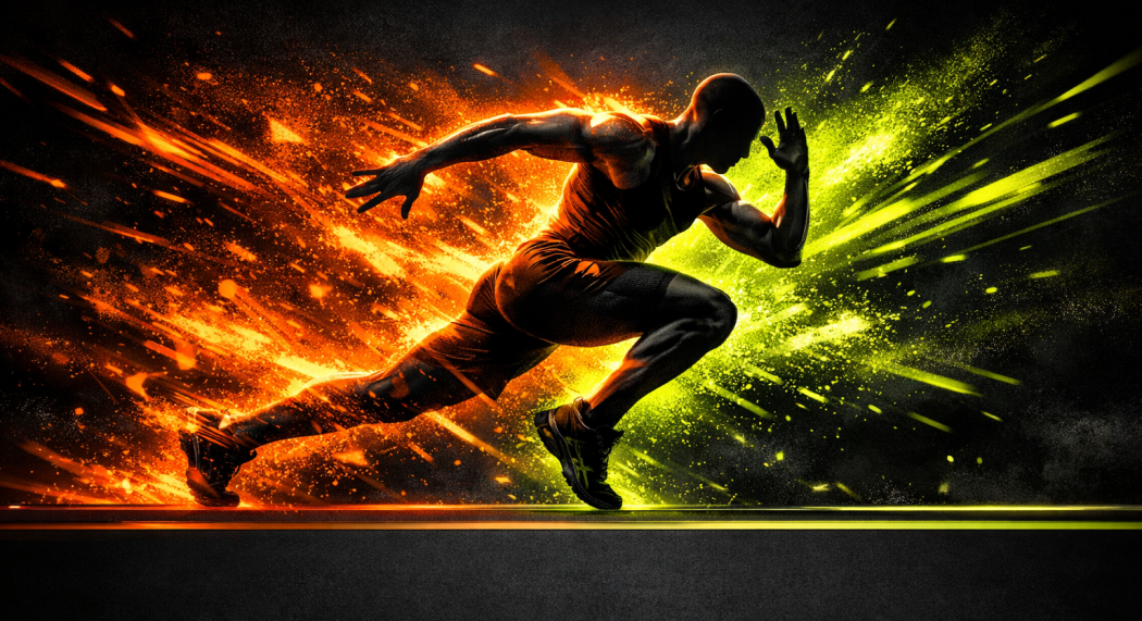 Яркий горизонтальный рекламный баннер для фитнес-студии. Центральный образ: силуэт атлетичной фигуры в динамичной позе (прыжок или выпад) на фоне абстрактных цветных всплесков и частиц энергии. Стиль — спортивная графика с элементами motion blur. Фон — темный (графитовый или черный) с контрастными акцентами: электрический оранжевый, лаймовый зеленый. Нижняя часть баннера — свободная полоса для текста. Настроение: взрывная энергия, драйв, мотивация. Антипромпт: realistic face, identifiable person, static pose, pastel colors, soft tones, feminine aesthetic, floral elements, blurry silhouette, text, watermark, low contrast, flat design, childish style, clip art.