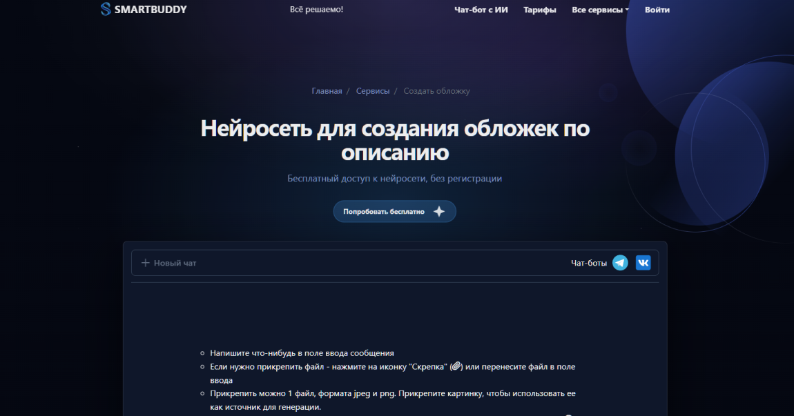 Инструмент для тех, кому важен результат за минимальное количество шагов. Логика простая: описываете задачу, выбираете стиль и формат — получаете готовый визуал. Никаких сложных настроек и многоуровневой регистрации: всё работает онлайн, прямо в браузере. SmartBuddy ориентирован на блогеров, независимых авторов и малый бизнес, когда создание баннеров нейросетью бесплатно позволяет начать, попробовать инструмент без финансовых затрат.