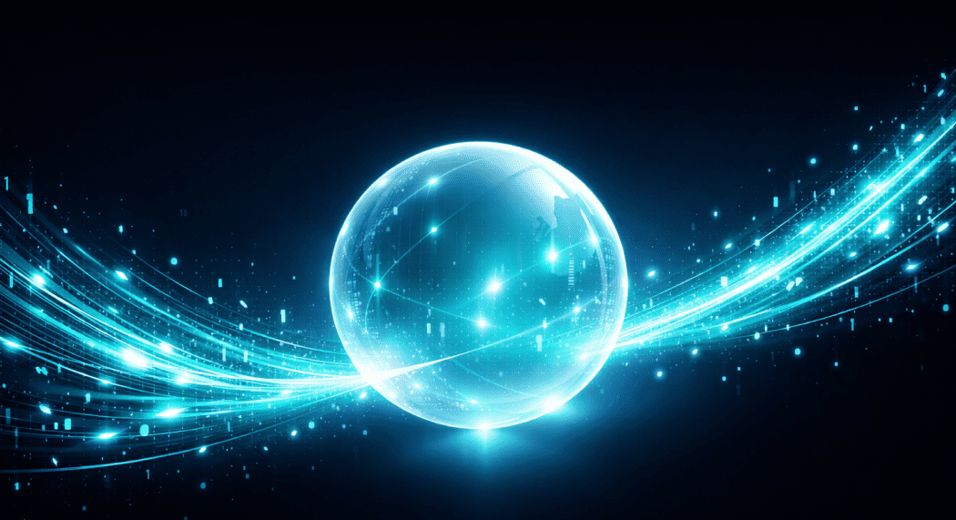 Широкоформатный рекламный баннер для IT-компании, формат 16:9. Композиция: абстрактная визуализация потока данных — светящиеся линии, узлы и цифровые частицы, формирующие волну от левого нижнего угла к правому верхнему. Центральная часть — полупрозрачная геометрическая фигура (куб или сфера), излучающая мягкое свечение. Фон — глубокий темно-синий, переходящий в черный. Акцентные цвета: бирюзовый, белый, легкие блики голубого. Стиль: футуристичная 3D-графика, чистая и выверенная композиция. Верхняя треть — свободная зона для заголовка. Атмосфера: инновации, технологичность, доверие. Антипромпт: realistic people, office photos, computer hardware, cluttered interface, bright warm colors, organic shapes, hand-drawn elements, retro style, lens flare, text, watermark, noisy grain, low resolution, flat 2D look, childish design.