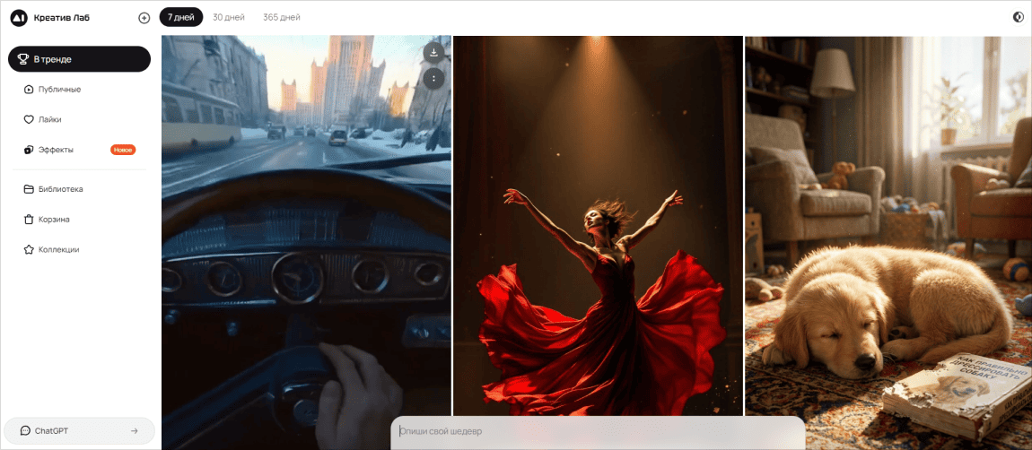 Креативная лаборатория, выстроенная вокруг визуального контента и готовых решений. Для вдохновения и быстрого старта сервис предлагает библиотеку шаблонов, коллекции стилей и публичную галерею работ других пользователей. Нейросеть для баннеров работает здесь через интуитивный интерфейс с минимумом настроек. Отдельный раздел «В тренде» собирает популярные креативы и помогает уловить актуальную визуальную стилистику.
