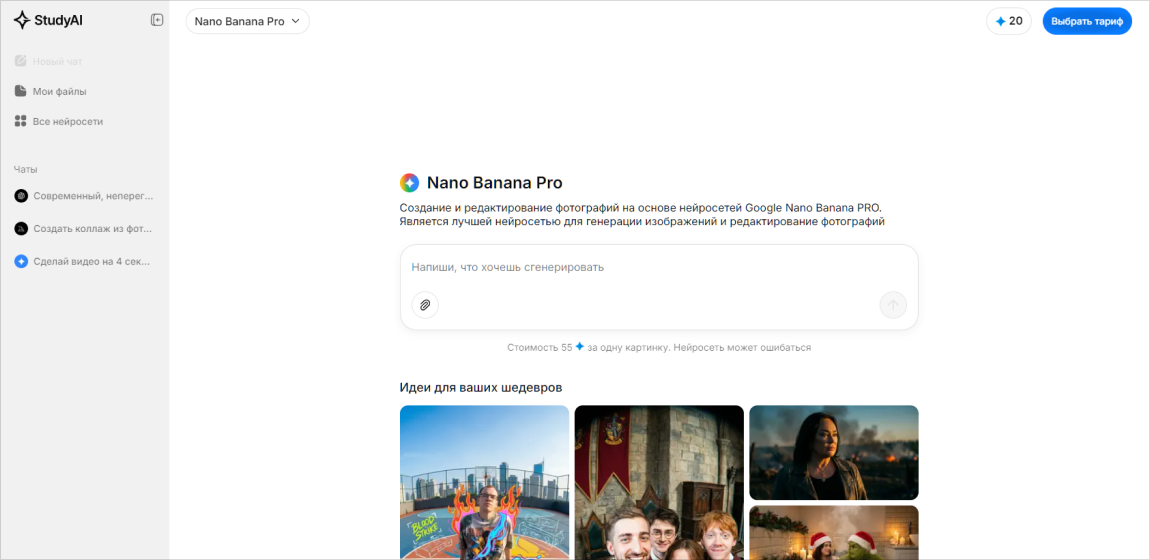 Платформа с набором специализированных ботов под разные задачи: от текстов до визуального контента. Среди инструментов есть генераторы, подходящие для тематических иллюстраций, презентационной графики и несложных рекламных баннеров. Минималистичный интерфейс сокращает порог входа для тех, кто впервые пробует создать баннер с помощью ИИ.