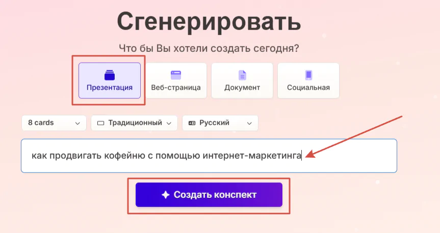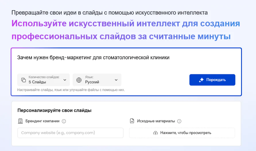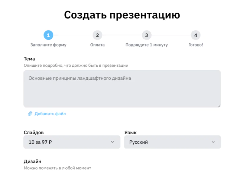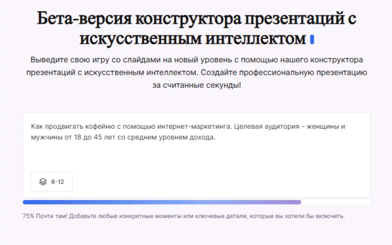 Для генерации презентации достаточно ввести тему и уточнить несколько деталей, например, указать целевую аудиторию