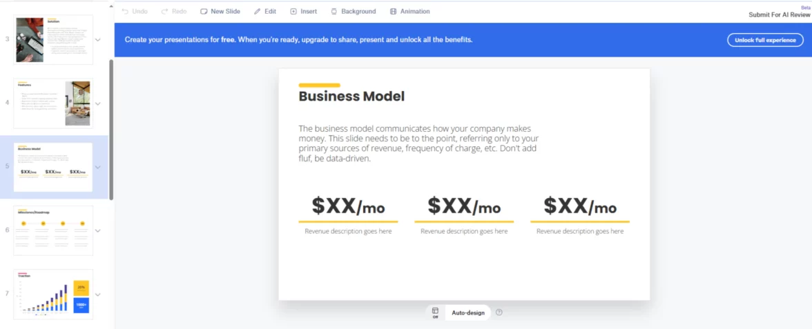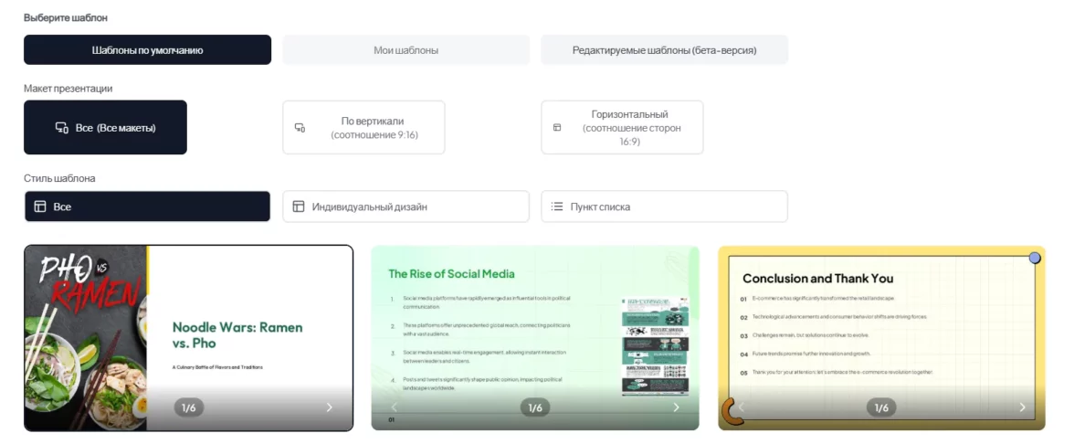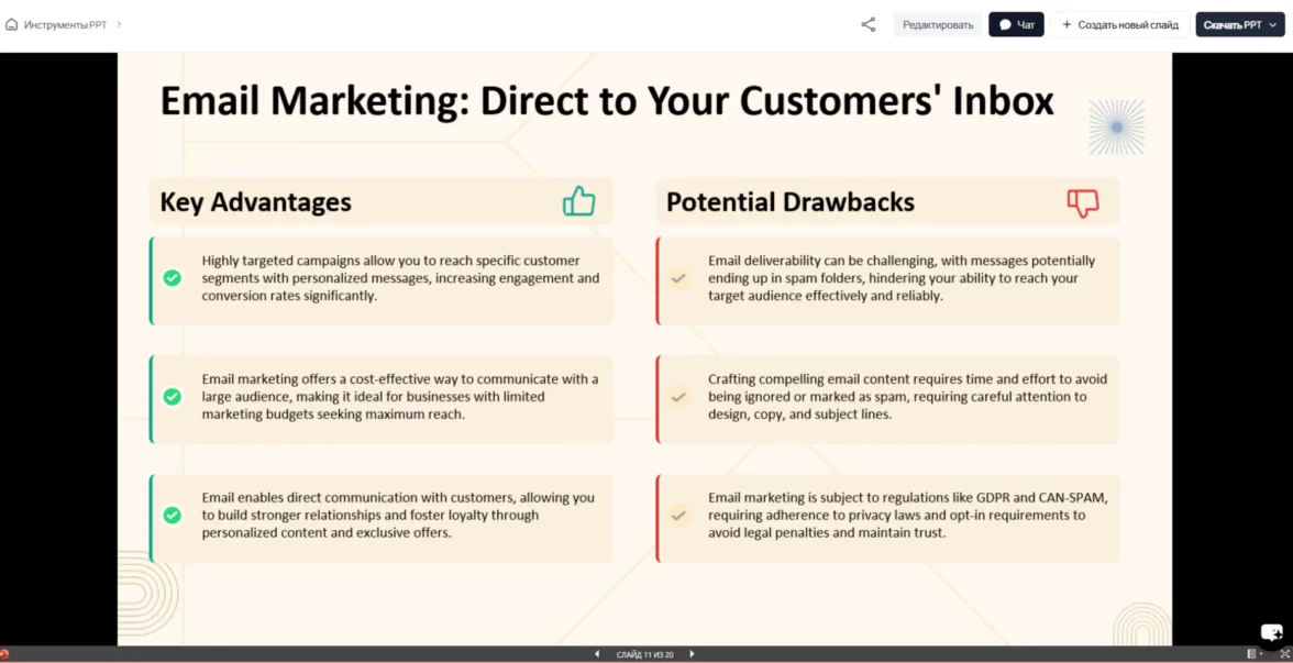 Есть встроенный редактор презентации с возможностью добавления новых слайдов и изменения дизайна сгенерированных.