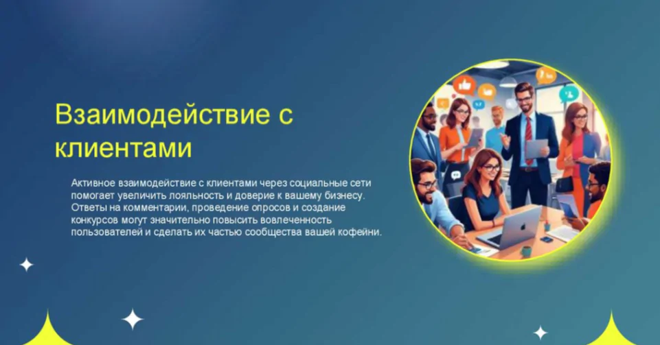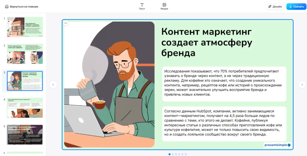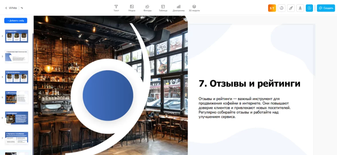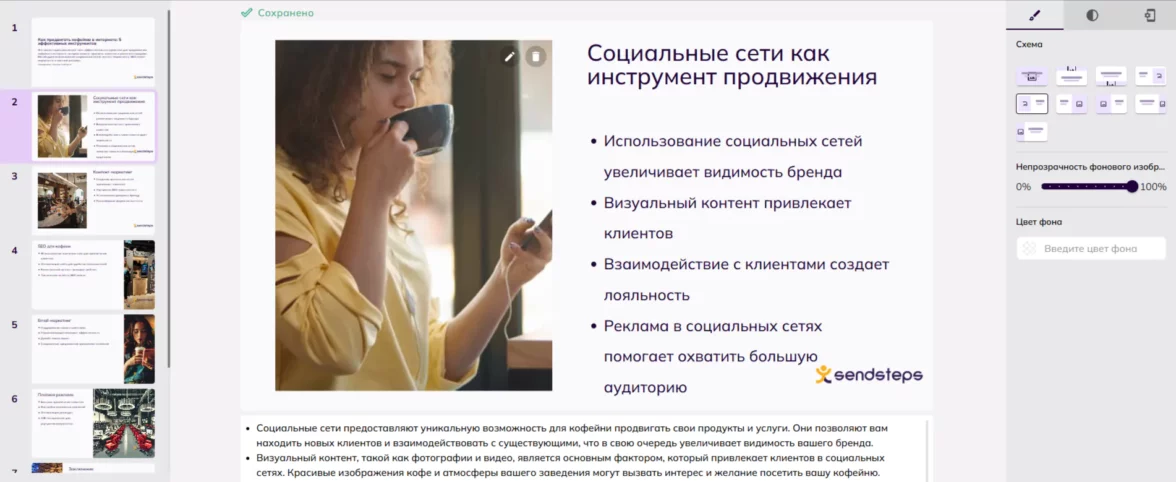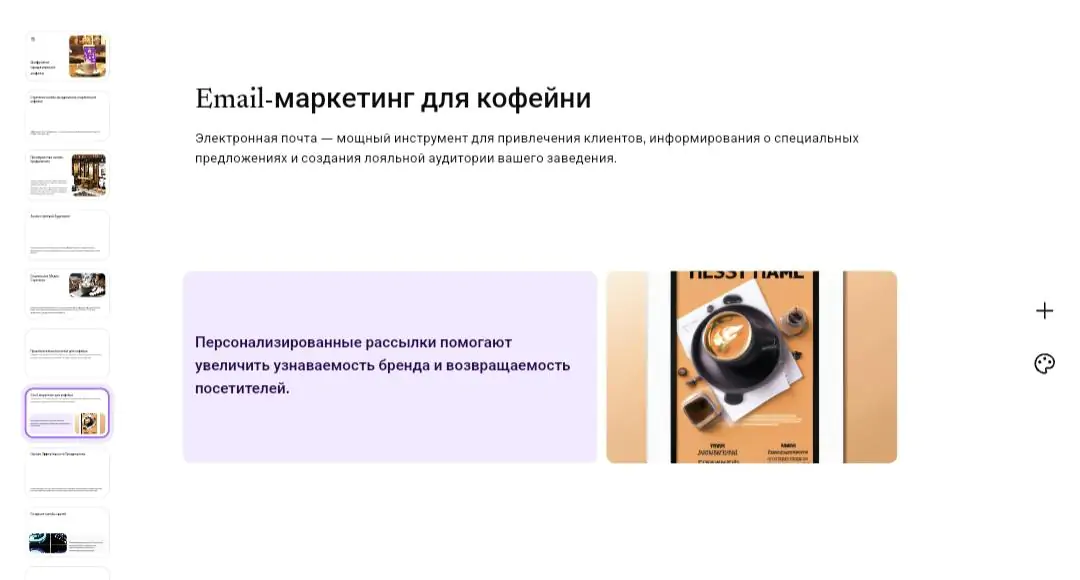 Пример генерации одного из слайдов по запросу «Как продвигать кофейню с помощью интернет-маркетинга»