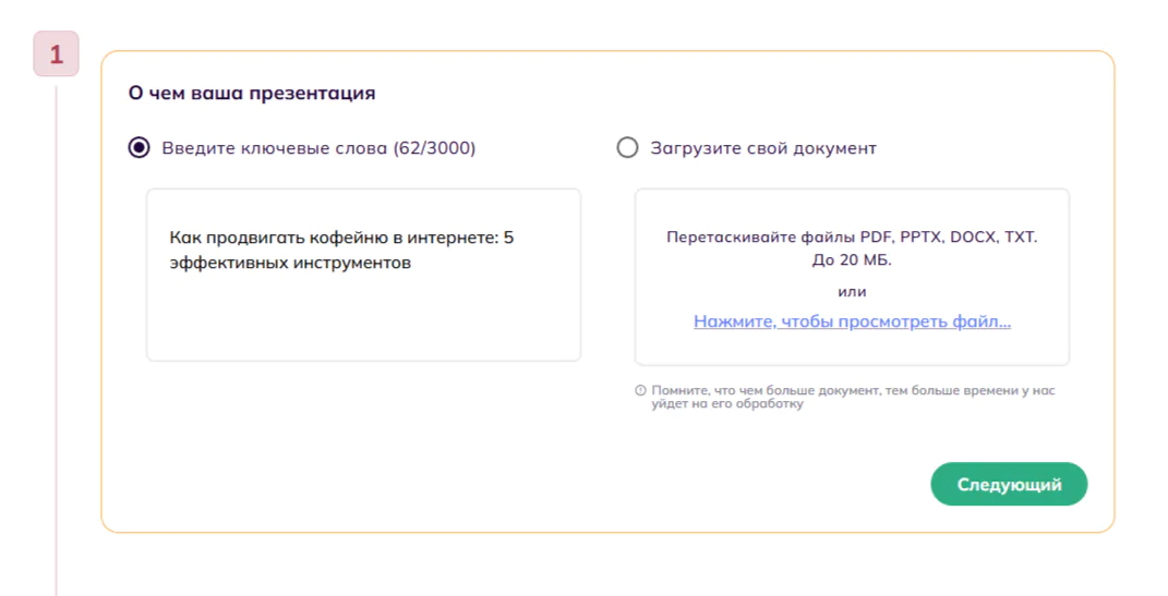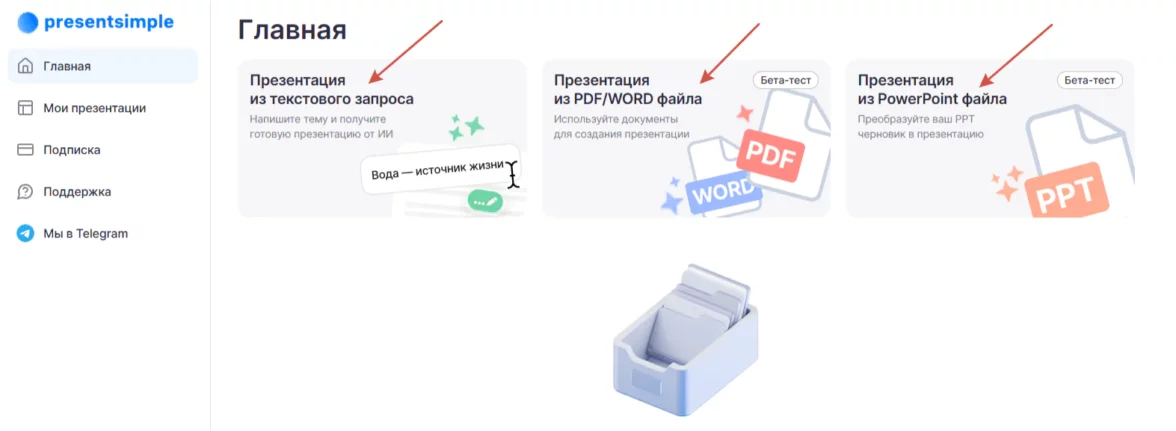 В Presentsimple можно импортировать презентацию PowerPoint, файлы docx и pdf, либо же просто написать текстовый запрос по теме