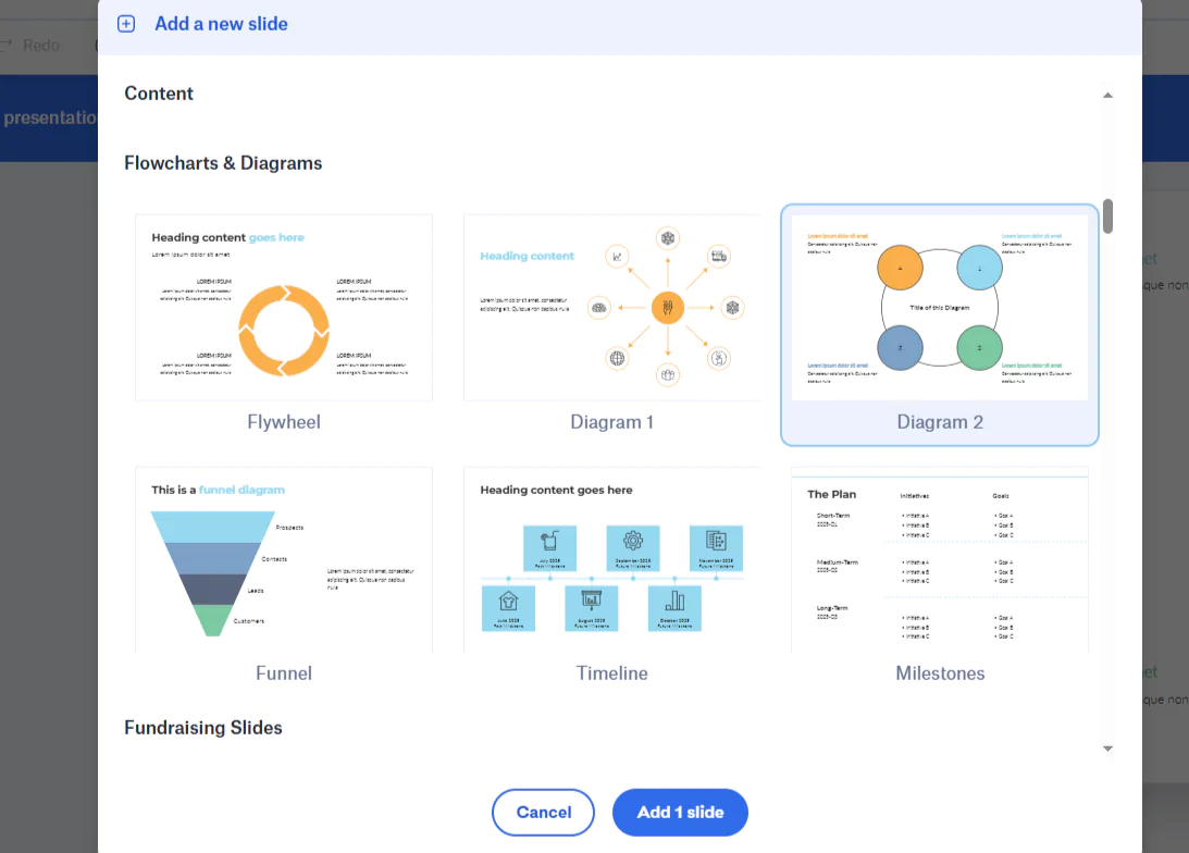 Этот сервис отличается от упомянутых выше, поскольку помогает не с нуля создать презентацию, а сделать её редизайн или переформатировать структуру слайдов. Например, можно выбрать один из десятков шаблонов, накидать в него готовый текст и изображения, и получить готовую вёрстку. Это удобно, если у вас уже есть готовые исходники, но нет понимания, как лучше всё это оформить в одну презентацию.
