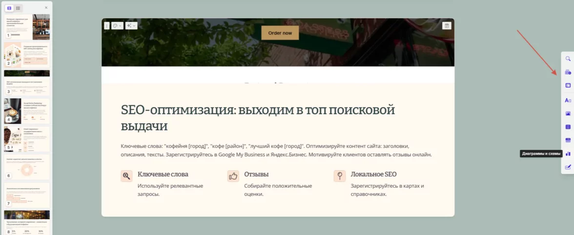 По нашему запросу нейронка в целом правильно раскрыла тему, предложив рабочие варианты для продвижения офлайн-бизнеса в онлайне. В блоке слева на главном экране собраны все слайды презентации, между которыми можно переключаться. В блоке справа есть инструменты для редактирования слайдов, например, замена изображения, добавление ссылок, графиков, выбор другого шаблона или макета.