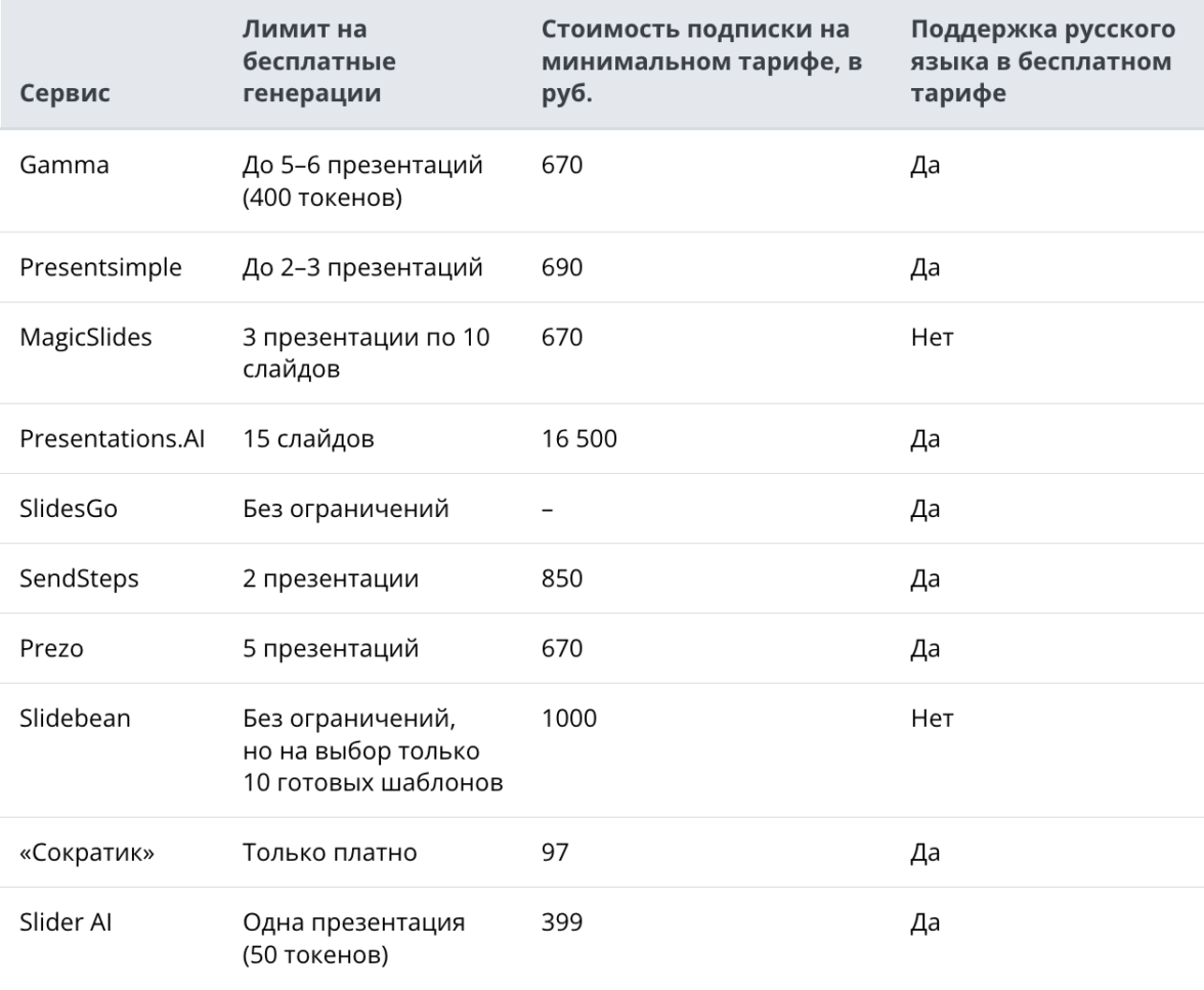 Сравнили в таблице 10 сервисов по нескольким критериям: лимиту на бесплатные генерации слайдов или целых презентаций, минимальной стоимости подписки и поддержке русского языка.