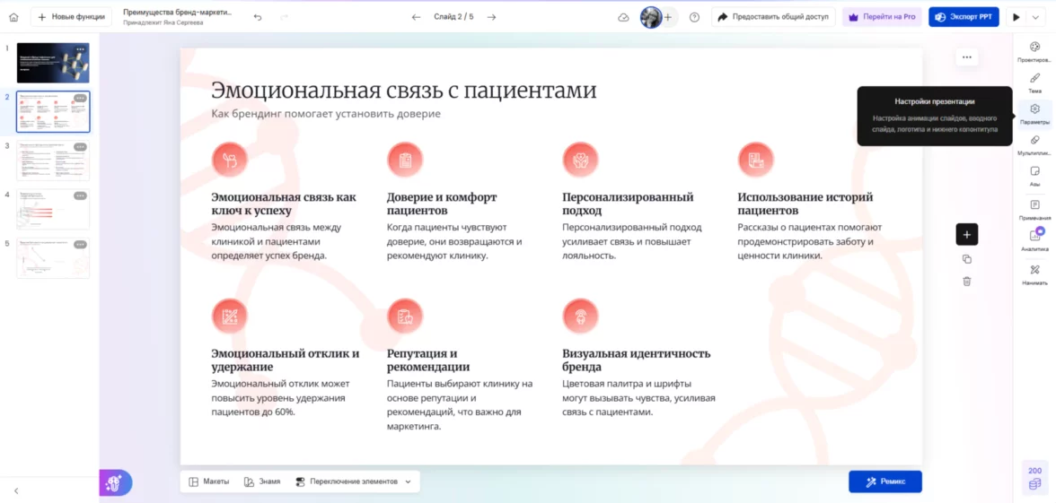 Нельзя выбрать тему и настроить дизайн презентации после генерации. Доступно только редактирование отдельных элементов слайда.