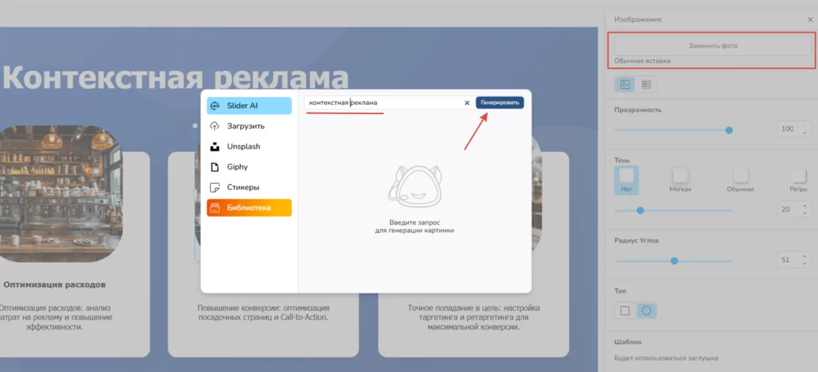 Если сгенерированные или подобранные из Unsplash фото не подойдут, можно за дополнительные токены заменить картинки. Кликните на фото, затем на три точки и в открывшемся меню справа нажмите на строку «Заменить фото».