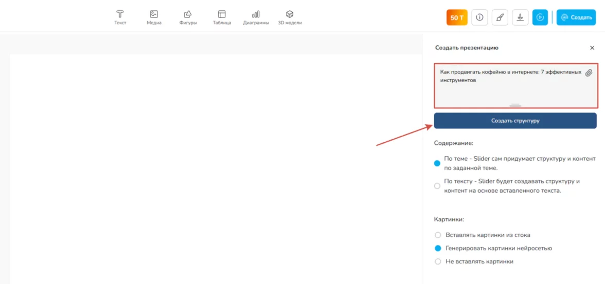 После регистрации нужно будет только ввести промпт, или тему презентации, и нажать на кнопку «Создать структуру». Когда генератор выдаст список слайдов, их можно удалить или добавить ещё новые, заменить темы и заголовки.
