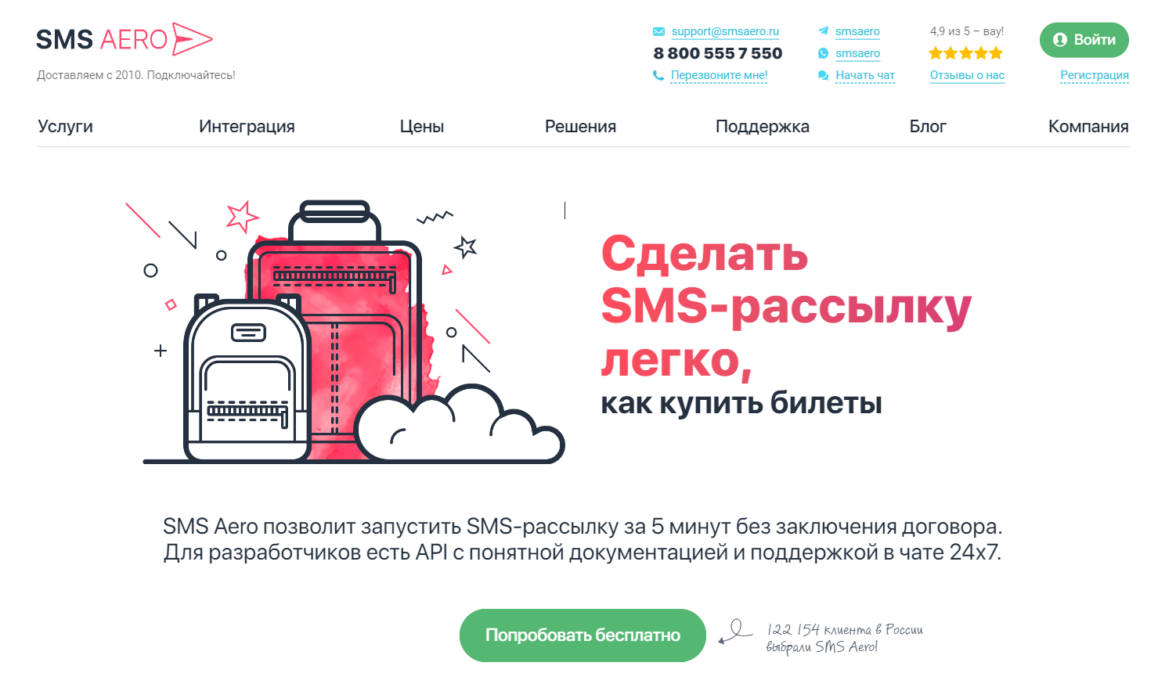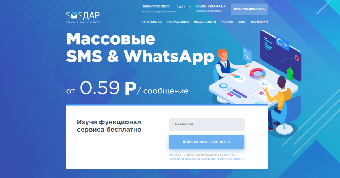 На третьем месте — SMS ДАР —сервис с похожим широким функционалом для мобильного маркетинга. Можно запускать рассылки по SMS, в WhatsApp, Telegram и Viber и получить бонусы за регистрацию.
