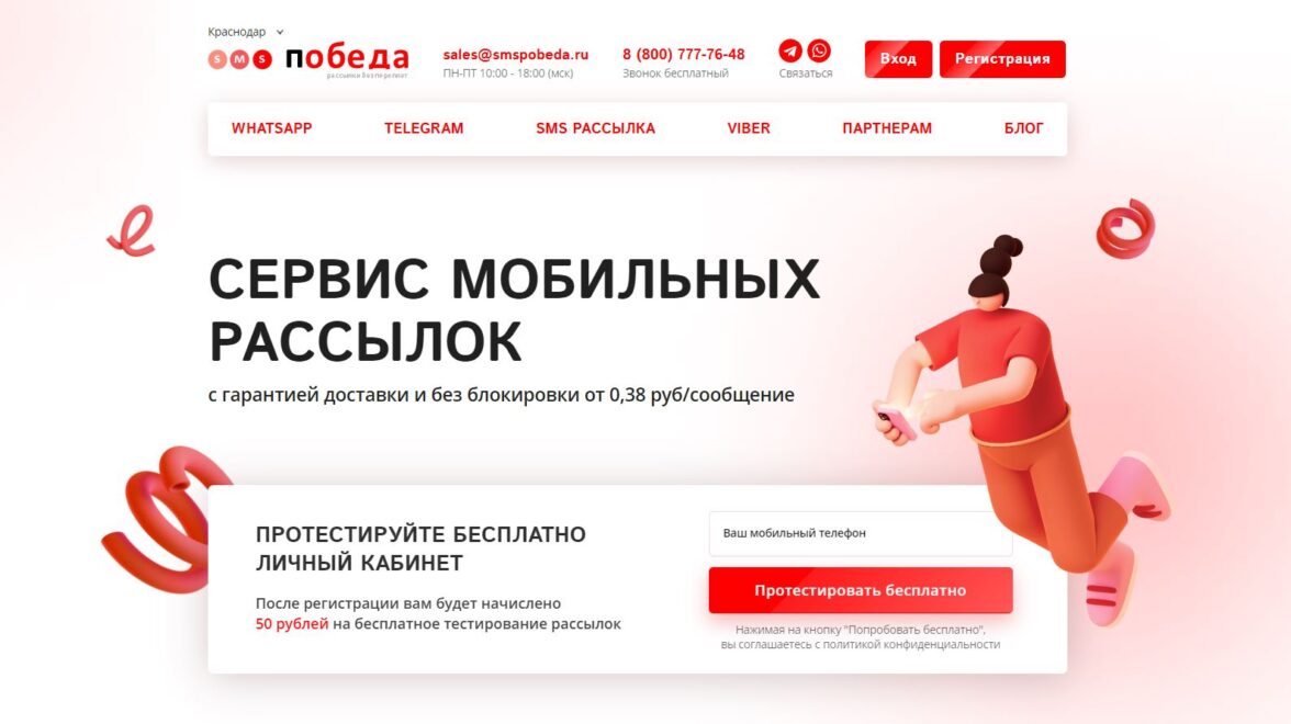SMS Победа — молодой (всего три года) сервис для мобильных рассылок взял лучшее из современного функционала ведущих конкурентов. Интуитивно понятный личный кабинет и современные маркетинговые инструменты для рассылки.