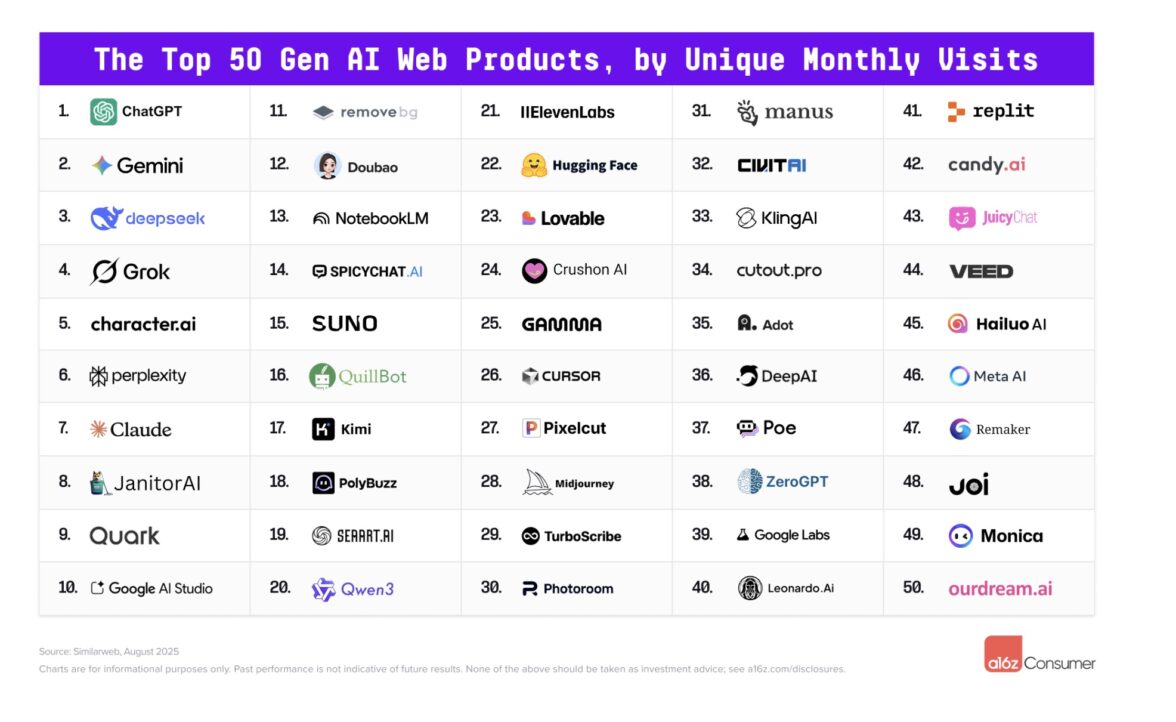 Венчурный фонд Andreessen Horowitz, известный также как a16z, раз в полгода публикует обзор ста самых популярных пользовательских ИИ-приложений, в которых используется генеративный ИИ — The Top 100 Gen AI Consumer Apps. 28 августа 2025 года вышел пятый по счету обзор.