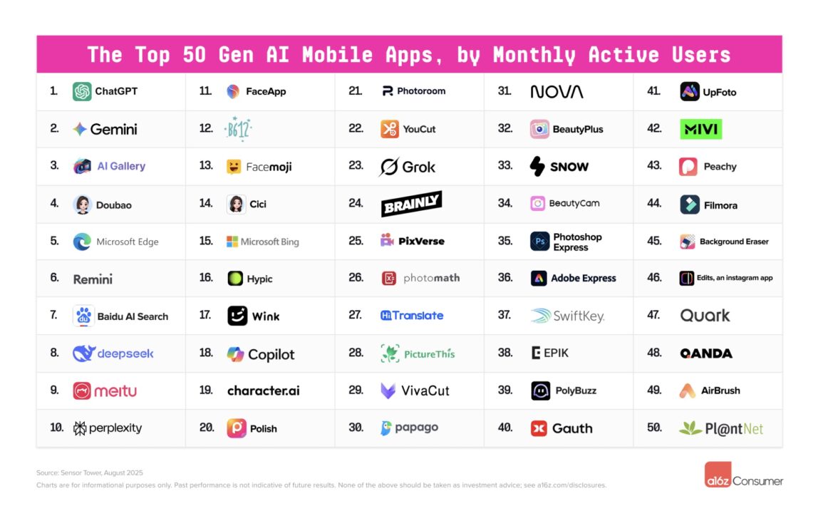 ChatGPT лидирует. Google и Grok догоняют. В Китае — свои чемпионы. Венчурный фонд Andreessen Horowitz выпустил обзор первой сотни самых популярных потребительских приложений, использующих генеративный искусственный интеллект (ИИ) — The Top 100 Gen AI Consumer Apps.