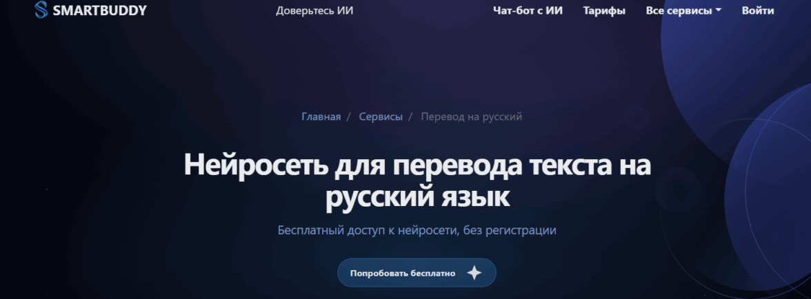 Виртуальный помощник, который фокусируется на естественной коммуникации. Если ваша цель — ИИ для перевода, который делает текст живым и «человечным», выбирайте этот инструмент. Платформа помогает адаптировать сложные обороты, делая их понятными для носителя языка. SmartBuddy отлично справляется с задачей очистки текста от канцеляризмов и лишнего формализма.