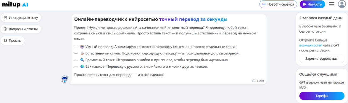 Этот сервис открывает доступ к языковым моделям через единый лаконичный интерфейс. Эта нейросеть для перевода текста на русский полезна тем, кто работает с большими массивами данных и требует высокого качества адаптации. Система четко держит нить повествования и не путается в сложных терминах. Главная фишка MashaGPT в том, что всё важное собрано в одном интерфейсе — вам не придется постоянно переключаться между вкладками и плодить хаос в браузере.