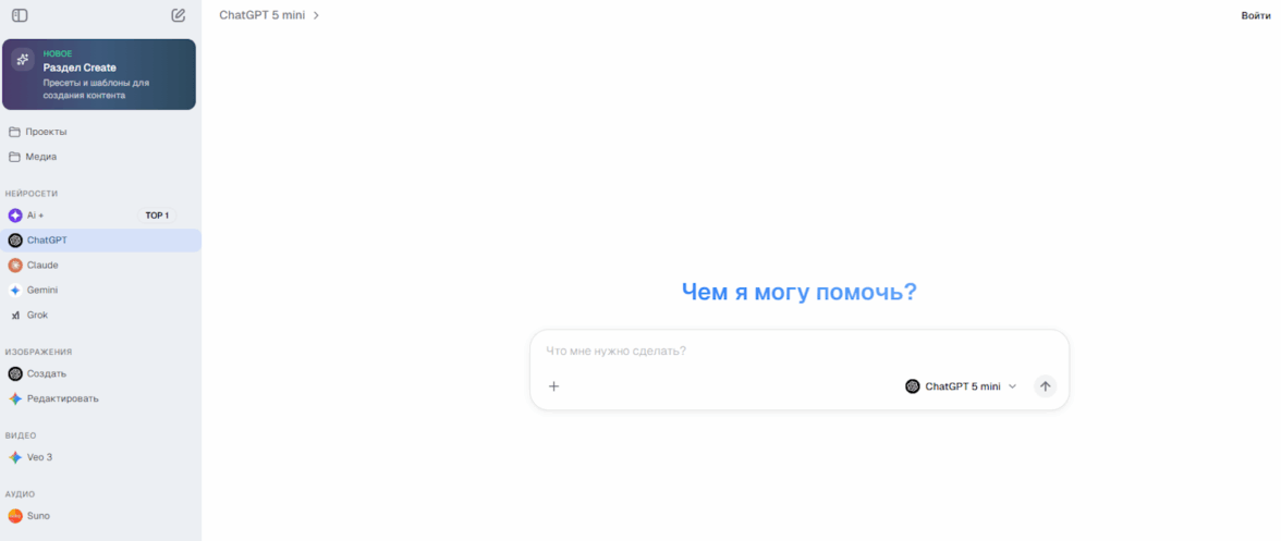 Российский агрегатор более 100 нейросетей (ChatGPT 5.2, Claude 4.5 Sonnet, Midjourney, DeepSeek, Gemini 3 Pro, Flux 2 Pro, Kling, Suno) для генерации текстов, изображений, видео, аудио и написании кода в едином интерфейсе. Платформа объединяет текстовые ИИ для креативных текстов и аналитики, генераторы музыки (Suno, ElevenLabs) и инструменты обработки (апскейл, обработка). Поддерживает анализ документов Word, Excel и PDF. Сервис является универсальным, так как дает доступ всем топовым моделям 2026 года.