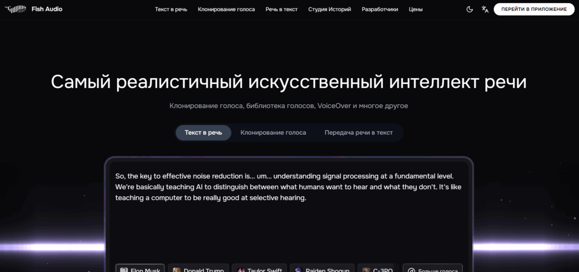 Fish Audio — генерирует выразительные голосовые дорожки и поддерживает быстрое клонирование голоса по образцу.